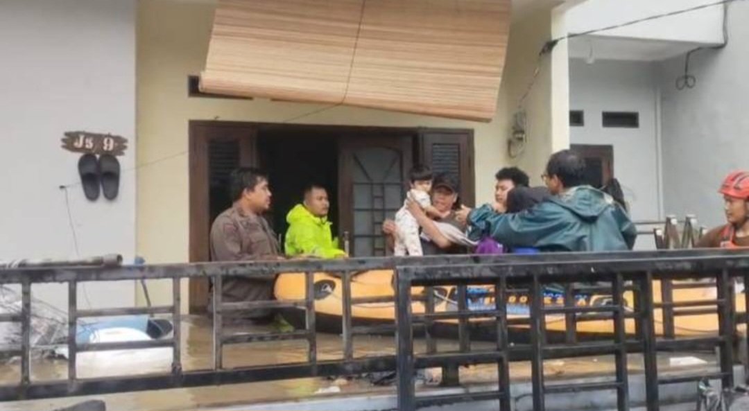 Dengan berjalan kaki menyusuri arus banjir yang cukup dalam, petugas menarik perahu karet menuju RW 09, titik terdampak paling parah. Di lokasi tersebut, petugas menjemput balita yang sebelumnya terjebak di lantai dua rumah mereka.